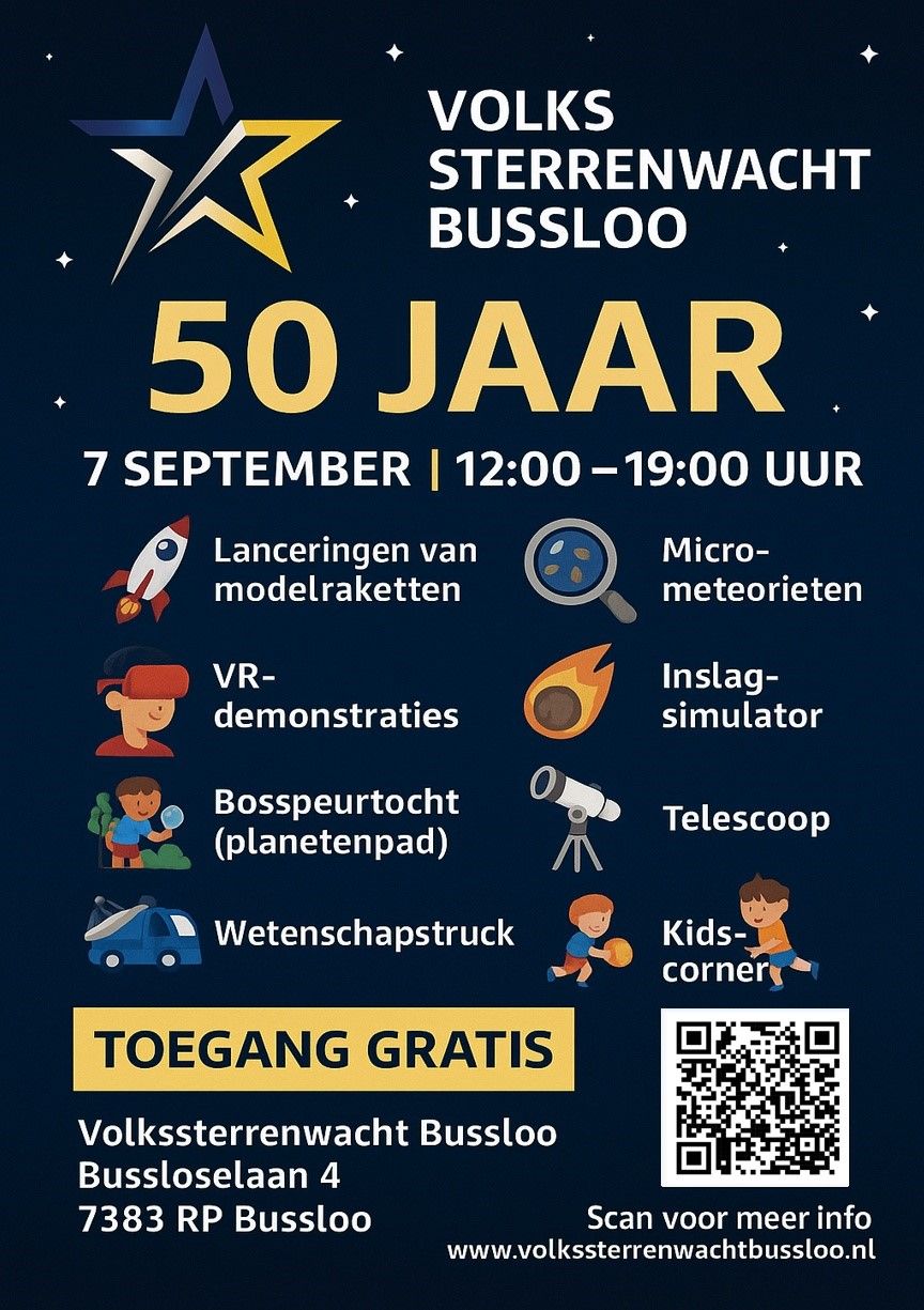 Op zondag 7 september 2025 organiseert de Volkssterrenwacht in het kader van haar 50-jarig bestaan een speciaal Jubileum Festival. In en rond het gebouw van de sterrenwacht zijn een grote hoeveelheid activiteiten. Vanaf 12.00 uur tot 19.00 uur is de sterrenwacht gratis toegankelijk met doorlopende activiteiten voor jong en oud. Bekijk hier het programma!